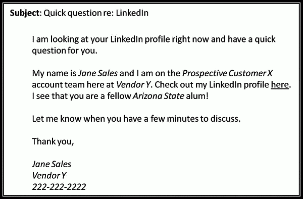 Меня зовут Джон Сэйлс, я работаю в компании Х над проектами Y. Вот мой профиль в LinkedIn. Я вижу, мы с вами окончили Аризонский университет!