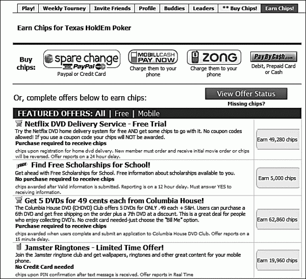 Игра в покер – приложение для Facebook, разработанное Zynga, – имеет семь миллионов постоянных пользователей. У нее нет отбоя от брендов-спонсоров (рис. 5.6). Пользователи Facebook могут зарабатывать фишки для этой игры, выполняя какие-то здания спонсоров – подписываясь на их рассылки или получая промоматериалы.