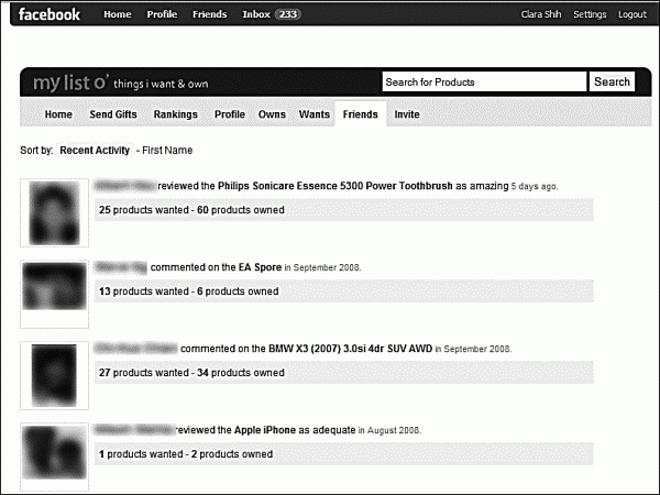 Рис. 5.10. MyListo позволяет людям заниматься продуктами, посылая, запрашивая и получая виртуальные подарки, соответствующие реальным продуктам, которые они хотели бы иметь в офлайновом мире