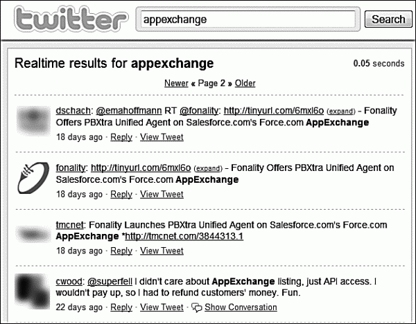 Рис. 6.2. Поиск в Twitter термина «AppExchange»