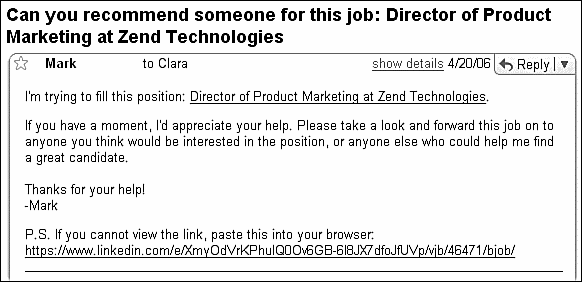 Рис. 7.5. Запрос на рекомендацию, присланный мне от моего контакта в LinkedIn. LinkedIn позволяет рекрутерам обращаться к расширенным сетям не только в поисках заинтересованных соискателей, но и в поисках рекомендаций соискателей. Это дает мультиплицирующий эффект в количестве людей, к которым они могут обратиться в пределах доверенных сетей