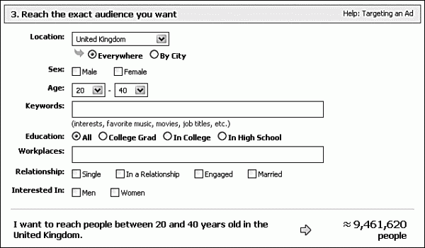 Рис. 9.5. Рекламодатели в Facebook могут гипертаргетировать свою рекламу на основании восьми параметров, видя при этом, сколько участников Facebook соответствуют заданным критериям