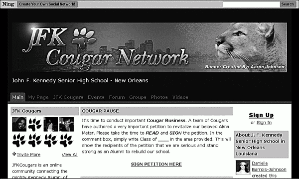 При разговоре о сетях по интересам обязательно нужно упомянуть и сервис Ning, который позволяет не очень подкованным с технической точки зрения людям создавать свои собственные сайты социальных сетей, посвященные своим собственным интересам. Это позволило, например, Высшей школе им. Кеннеди в Новом Орлеане создать полноценный сайт для выпускников, родителей и студентов, на котором публикуются новости школы, одноклассники могут связываться друг с другом и с учителями, размещать фотографии, видео, участвовать в добровольческих инициативах (рис 1.3). Благодаря инструментам Ning администраторы разработали и запустили этот сайт за очень короткое время. Эта частная социальная сеть школы оказалась особенно важной после того, как ураган Катрина заставил студентов эвакуироваться в начале 2005/06 учебного года. Сеть позволила родителям и администраторам оказывать друг другу поддержку, делиться информацией и организовать перевод учащихся в другие учебные заведения.