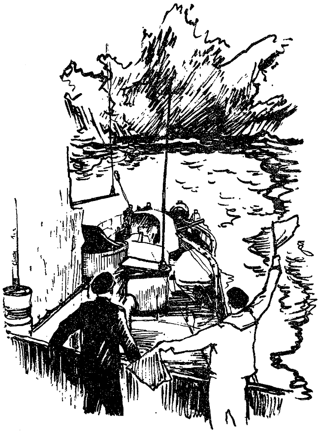Выглянув, Гаичка увидел черную обожженную краску на надстройке, пелену дыма над баком и огненные иглы, улетающие вдаль по крутой дуге. Потом эти иглы как-то странно переломились в полете и вонзились в море. На фоне горящей зари взметнулись темные столбы воды, затем море вспучилось, прокатился растянутый во времени рокот взрыва, словно отдаленный гром. И в том месте, где только что пучились бугры воды, малиновым светом вспыхнула яркая свеча, обозначающая место подлодки. Сторожевик летел на эту свечу, дрожа всем корпусом, отбрасывая зелено-розовые пологие волны.