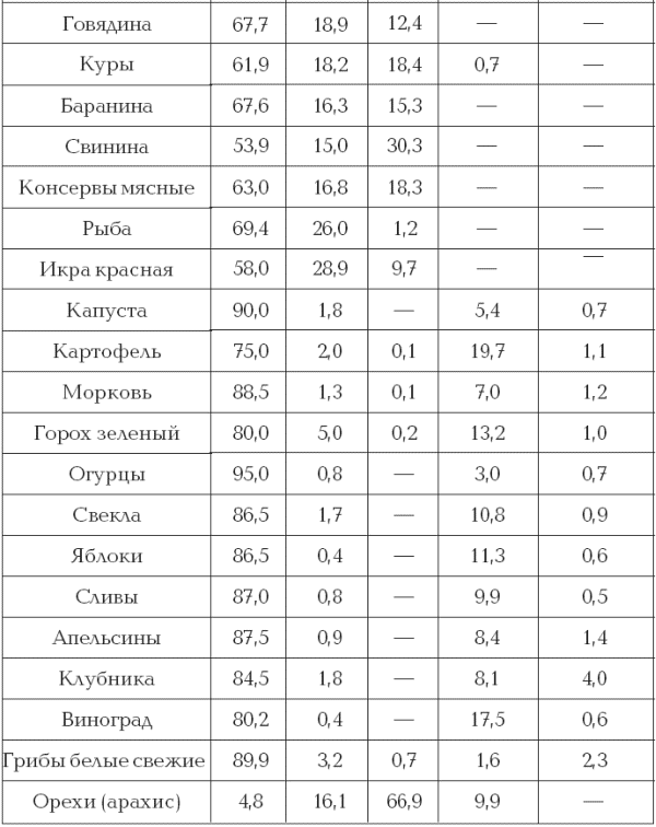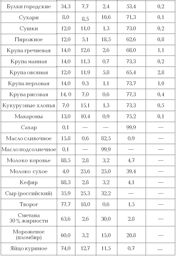 Ниже мы приводим специально для вас таблицу 2 с химическим составом и энергетической ценностью основных пищевых продуктов (в пересчете на 100 г продукта).