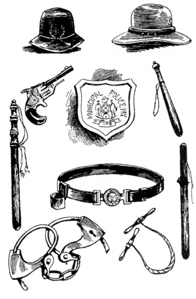 Каждый полицейский был вооружен дубинкой длиной 56 см, сперва из палисандра, а после подавления вербовочных бунтов во время Гражданской войны, когда выяснилось, что они легко раскалываются, — из древесины белой акации. С 1887 года необходимым снаряжением патрульного наряду с дубинкой стало огнестрельное оружие. Резные деревянные свистки с горошиной внутри в нью-йоркской полиции используются с конца 1850-х годов, до этого сигналы подавались ударами дубинки по стенам, урнам или просто выстрелами в воздух. Около 1889 года был принят на вооружение свисток с характерным громким звуком, такой же, как у английских констеблей.