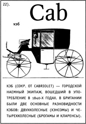Кэб (Сокр.От cabriolet) — городской наемный экипаж, вошедший в употребление в 1840-х годах. в британии были две основные разновидности кэбов: двухколесные (хэнсомы) и четырехколесные (брогамы и кларенсы).