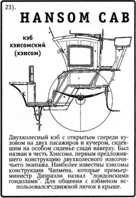 Двухколесный кэб с открытым спереди кузовом на двух пасажиров и кучером, сидевшим на особом сиденье сзади наверху. Был назван в честь Хэнсома, первым предложившего конструкцию двухколесного извозчичьего экипажа. Наиболее известны хэнсомы конструкции Чапмена, которые премьер-министр Дизраэли назвал «лондонскими гондолами». Для общения с кэбменом ис-пользовался'сдвижной лючок в крыше.