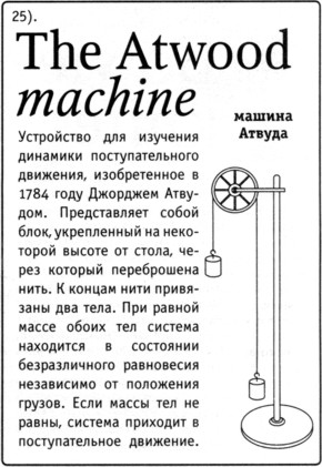 Устройство для изучения динамики поступательного движения, изобретенное в 1784 году Джорджем Атву-дом. Представляет собой блок, укрепленный на некоторой высоте от стола, через который переброшена нить. К концам нити привязаны два тела. При равной массе обоих тел система находится в состоянии безразличного равновесия независимо от положения грузов. Если массы тел не равны, система приходит в поступательное движение.
