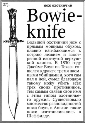Большой охотничий нож с прямым мощным обухом, плавно изгибающимся к острию лезвием и заостренной изогнутой верхушкой клинка. В 1830 году Джеймс Боуи из Техаса сошелся в драке с тремя наемными убийцами и, хотя сам пал в ней, сумел благодаря такому ножу убить всех трех своих противников, тем самым связав свое имя с этим типом охотничьего оружия. Существовало множество разновидностей ножа боуи, в Англии такие ножи изготавливались в Шеффилде.