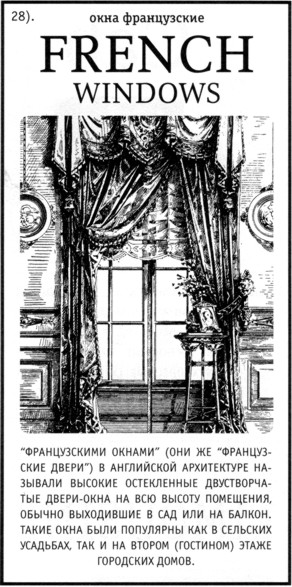 «Французскими окнами» (они же «французские двери») в английской архитектуре называли высокие остекленные двустворчатые двери-окна на всю высоту помещения, обычно выходившие в сад или на балкон. такие окна были популярны как в сельских усадьбах, так и на втором (гостином) этаже городских домов.