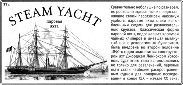 Сравнительно небольшие по размерам, но роскошно отделанные и предоставлявшие своим пассажирам максимум удобств, паровые яхты стали излюбленными судами для развлекательных круизов. Классическая форма паровой яхты, подражавшая корпусам чайных клиперов и имевшая вытянутый нос с декоративным бушпритом, была внедрена во второй половине 1890– х годов знаменитым конструктором яхт Джорджем Ленноксом Уотсоном. Суда этого типа использовались не только для развлечений, паровые яхты стали наиболее распространенным судном для полярных исследований в конце XIX — начале XX века.