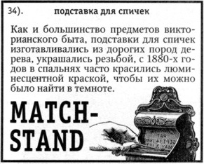 Как и большинство предметов викторианского быта, подставки для спичек изготавливались из дорогих пород дерева, украшались резьбой, с 1880-х годов в спальнях часто красились люминесцентной краской, чтобы их можно было найти в темноте.