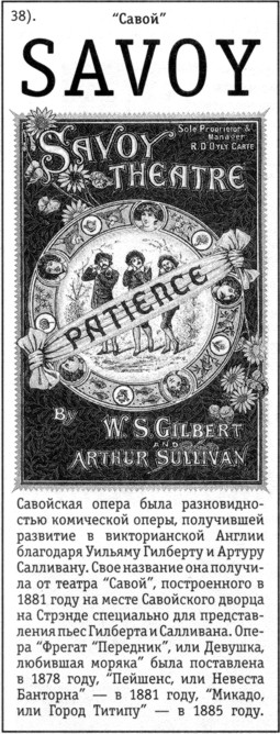 Савойская опера была разновидностью комической оперы, получившей развитие в викторианской Англии благодаря Уильяму Гилберту и Артуру Салливану. Свое название она получила от театра «Савой», построенного в 1881 году на месте Савойского дворца на Стрэнде специально для представления пьес Гилберта и Салливана. Опера «Фрегат „Передник“, или Девушка, любившая моряка» была поставлена в 1878 году, «Пейшенс, или Невеста Банторна» — в 1881 году, «Микадо, или Город Титипу» — в 1885 году.