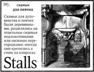 Скамьи для духовенства и певчих были деревянными, разделялись на отдельные сиденья подлокотниками или низкими перегородками; иногда они крепились к стене на клиросах.
