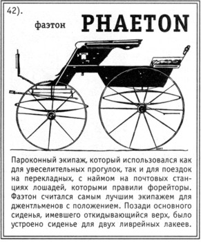 Пароконный экипаж, который использовался как для увеселительных прогулок, так и для поездок на перекладных, с наймом на почтовых станциях лошадей, которыми правили форейторы. Фаэтон считался самым лучшим экипажем для джентльменов с положением. Позади основного сиденья, имевшего откидывающийся верх, было устроено сиденье для двух ливрейных лакеев.