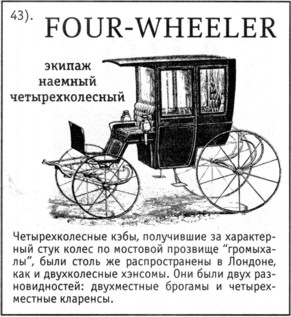 Четырехколесные кэбы, получившие за характерный стук колес по мостовой прозвище «громыха-лы», были столь же распространены в Лондоне, как и двухколесные хэнсомы. Они были двух разновидностей: двухместные брогамы и четырехместные кларенсы.