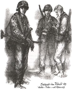 Некоторое время они сидели молча. Эрнст отряхивал свою плащ-палатку, потом снова сел и свернул две цигарки. Блондин осматривал округу. Его взгляд остановился на цепи холмов, которые темной массой, почти угрожающе закрывали горизонт.