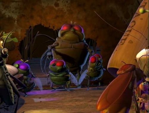 — Город! — восхищенно воскликнул Флик и двинулся дальше. Остановившись посреди дороги, он засмотрелся на светлячка, игравшего роль светофора, который как раз вытащил свой фонарик на брюхе из красного стеклянного колпачка, и вставил в зеленый. И тотчас масса жуков устремилась по улице, на которой стоял Флик, грозя сбить его с ног и растоптать. Флик увернулся от пары особенно стремительных жуков и добежал до обочины.
