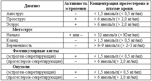 Кисты и неоплазия яичников. Прогестерон-секретирующие кисты и опухоли (например, гранулезотекаклеточные опухоли) могут прекращать циклическую активность яичников, поскольку вырабатывают прогестерон, подавляющий секрецию гонадотропинов. В таких случаях концентрация прогестерона в плазме крови превышает 6 нмоль/л (2 нг/мл). Наличие крупной опухоли устанавливают с помощью пальпации, рентгенографии или УЗИ. В основном прогестерон-секретирующие новообразования имеют небольшие размеры, бывают как одиночными, так и множественными, захватывают один или оба яичника. Уровень прогестерона снижен по сравнению с фазой метэструса (более 1,5–6 нмоль/л, 0,5–2 нг/мл), причем снижение наблюдается в течение более длительного по сравнению с метэструсом периода (60–90 дней). Лечение заключается в даче животному простагландинов, способных вызывать регрессию лютеиновой ткани, или хирургическом удалении новообразований. Опухоли и кисты, не обладающие гормональной активностью (например, в rete ovarii), вызывают атрофию яичников (в случае двустороннего поражения), что обусловливает отсутствие течки.