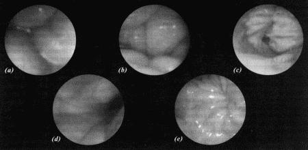Эндоскопическое исследование слизистой влагалища. Динамика изменений на протяжении цикла: (а) проэтрус — розовая окраска и отечность; (b) начало эструса — слизистая бледнеет, отек начинает уменьшаться (обычно перед пиком ЛГ); (c) середина эструса — слизистая бледная, уменьшение отека (сморщивание) явно выражено, что соответствует середине фертильного периода; (d) начало метэструса — видны закругленные складки, при прикосновении слизистая смыкается, образуя розетку (е) (см. Приложение)