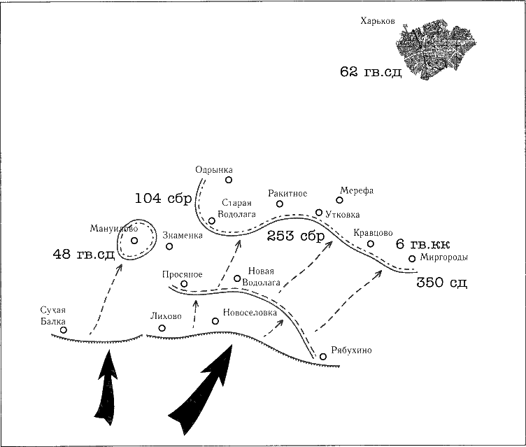 Развивая наступление, в ночь на 13 марта немецкие войска заняли Сороковку и Рогань и атаковали Каменную Яругу, выйдя на основную коммуникацию армии. К исходу 14 марта противник занял Терновую, Лизогубовку, Боровое и Водяное, прервав все пути подвоза. К этому моменту в городе продолжали обороняться части 19-й стрелковой дивизии и 17-й бригады войск НКВД при поддержке 179-й отдельной и 86-й танковых бригад. 62-я гвардейская стрелковая дивизия и остатки 303-й и 350-й стрелковых дивизий оборонялись в районе Жихар, Безлюдовка, 104-я стрелковая бригада удерживала район Лялюки, 253-я стрелковая бригада оборонялась в районе Кулиничи. Утром 15 марта, получив разрешение штаба фронта на оставление Харькова, командующий 3-й танковой армией отдал приказ о прорыве защищающих город частей в направлении Малиновка, Граково с последующим выходом на восточный берег реки Северский Донец на фронте Старый Салтов—Волчанок.229