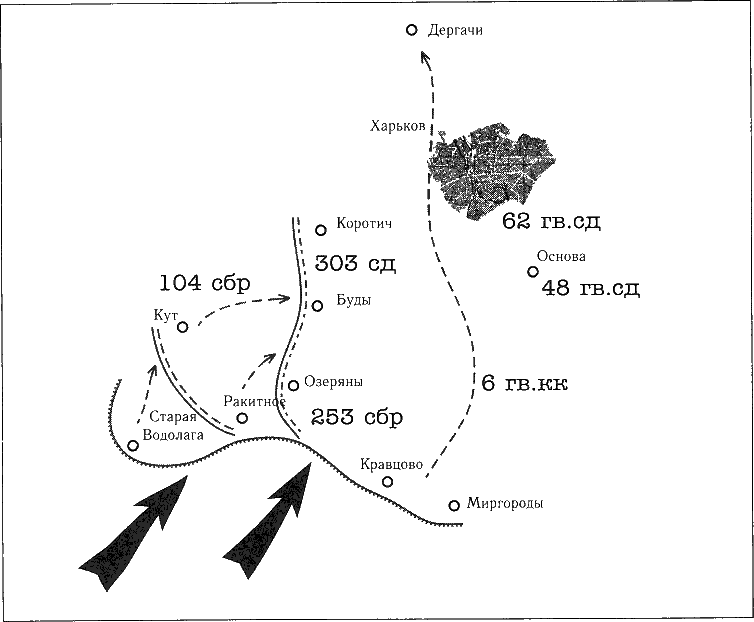 10 марта положение соединений 3-й танковой армии вновь существенно ухудшилось — наступающие немецкие войска обошли Харьков с севера, прорвали оборону 6-го гвардейского кавкорпуса в районе Дергачей и продолжили наступление в северном и северо-восточном направлениях, угрожая окружить всю группировку советских войск, оборонявшихся в районе Харькова. К исходу дня пехота противника начала отдельными группами просачиваться в город со стороны северных окраин. Немецкие пехотинцы, «…засев небольшими группами в разрушенных зданиях и на чердаках, вели обстрел машин и проходящих одиночек и групп военных. Огонь автоматчиков дополнялся стрельбой одиночек украинских националистов, ведущих огонь с чердаков и окон верхних этажей разрушенных зданий. Борьба с одиночками была очень затруднена, так как последние укрывались среди развалин».225 В состав армии вошла 19-я стрелковая дивизия, занявшая оборону в районе Солоницевка. Вновь сказались негативные последствия «двоевластия» — оборонявшая по указанию командования 3-й танковой армии Песочин 86-я танковая бригада получила указание начальника обороны города генерал-лейтенанта Козлова о выдвижении на северную окраину города, имея задачу прикрыть шоссе Харьков—Дергачи. Остальные соединения армии оборонялись на прежних позициях.226