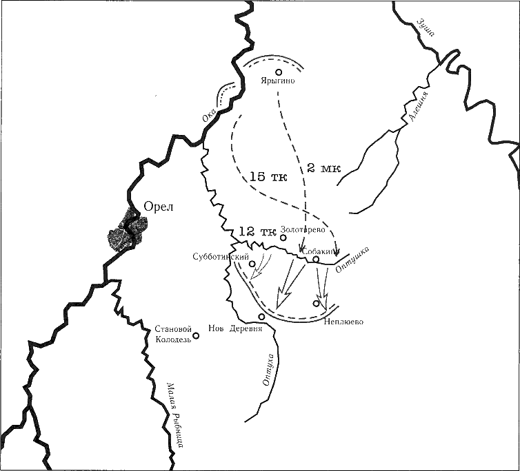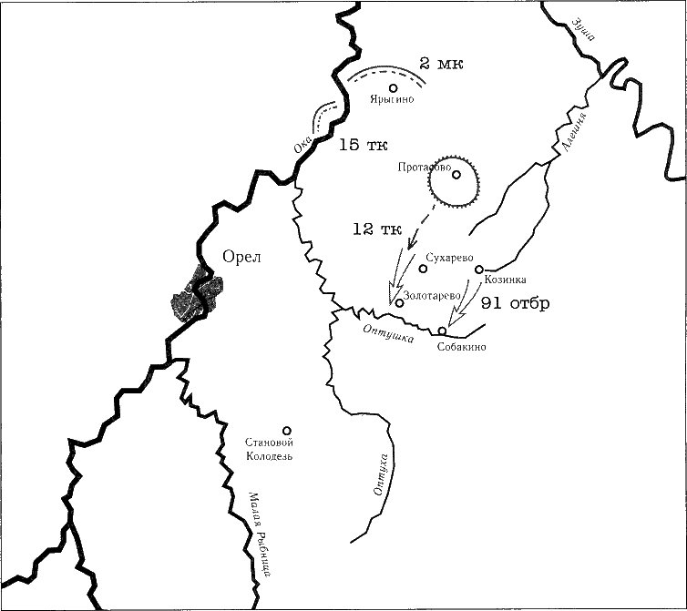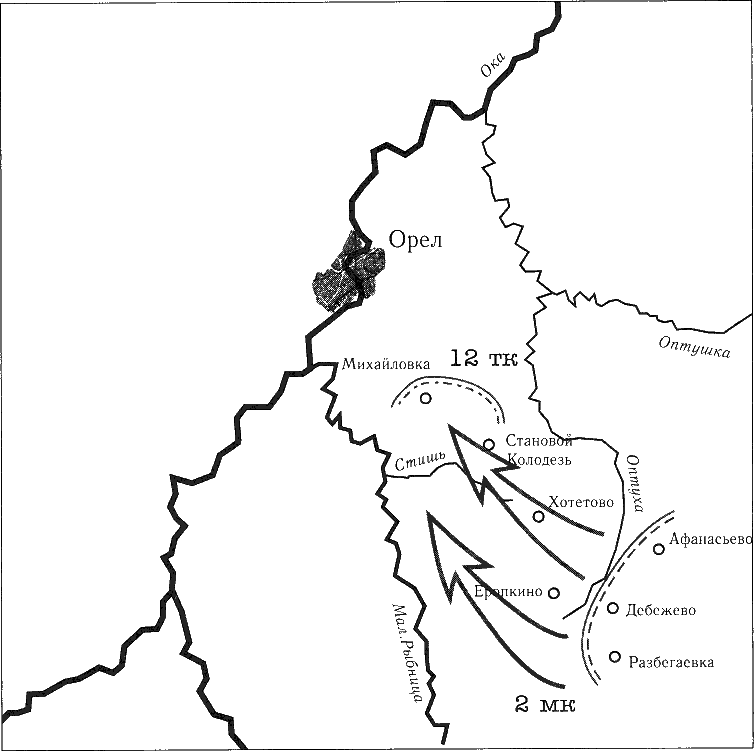 Тем не менее общее положение дел на фронте 3-й гвардейской танковой армии не внушало особого оптимизма. Задача, поставленная еще 18 июля (захватить Становой Колодезь и перерезать железную дорогу Орел—Курск), выполнена так и не была. В результате трехдневных боев 21–23 июля части танковой армии оказались в междуречье рек Оптушка и Оптуха; продолжение наступления на Становой Колодезь на том же участке означало необходимость форсирования реки Оптуха и прорыва спешно оборудуемой немцами на западном берегу Оптухи линии обороны. На участок наступления 3-й гвардейской танковой армии противником перебрасывались резервы — например, рубеж обороны на реке Оптушка, в дополнение к располагавшимся в этом районе еще до вступления 3-й гвардейской танковой армии в бой 262-й пехотной и 8-й танковой дивизиям Вермахта, удерживала также 78-я пехотная дивизия, спешно переброшенная противником с Кромского направления.286 Ни о какой внезапности дальнейшего удара не могло быть и речи. Невзирая на неоднократные попытки прорвать линии вражеской обороны, армии так и не удалось войти в прорыв и выйти на коммуникации противника. Бои приняли форму упорных кровопролитных лобовых столкновений с обороняющимся на заранее подготовленной позиции противником и завершались «выдавливанием» противника с занятых им рубежей, не приводя к прорыву. В этих условиях командование Брянским фронтом приняло решение сместить направление удара 3-й гвардейской танковой армии к югу. 23 июля 3-й гвардейская танковая армия получила указание совершить марш и сосредоточиться: