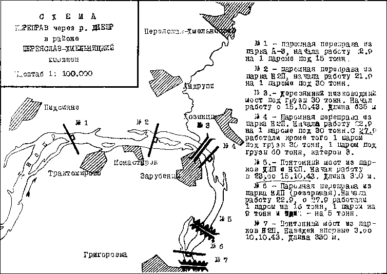 Кроме того, 28 сентября армии была придана 6-я понтонная бригада,424 начавшая строительство двух понтонных переправ грузоподъемностью до 16 тонн в районе Григоровки. Всего к 1 октября армия располагала двумя понтонными мостами (в районе Григоровки и в 2 км севернее Григоровки) и шестью паромными переправами: переправа в районе Подсинне и две переправы в районе пристани Переяслав обслуживали части 7-го гвардейского танкового корпуса, переправа в Зарубенцах обслуживала 9-й мехкорпус и армейские части, две переправы в районе понтонных мостов у Григоровки находились в резерве.425