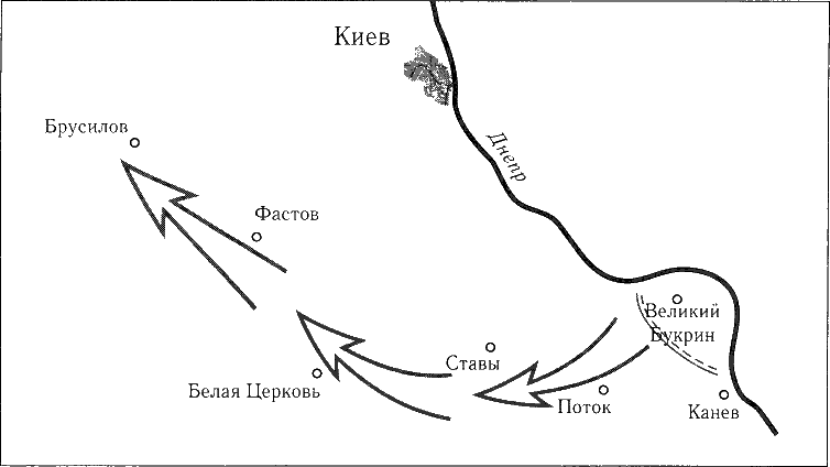 Прочное закрепление за собой Букринского плацдарма, сосредоточение на нем основных сил 3-й гвардейской, 40-й и 27-й армий и организация бесперебойной переправы и снабжения войск позволили советскому командованию начать подготовку к наступлению с Букринского плацдарма, в соответствии с первоначальным замыслом, в общем направлении на Кагарлык, Фастов, Брусилов с целью охвата киевской группировки противника с юга. Согласно плану командования фронта, к исходу первого дня наступления войскам армии предстояло выйти в район Поток, к исходу второго дня достичь Ставы, к исходу третьего дня овладеть Белой Церковью, к исходу четвертого дня выйти в район Фастов и на пятый день наступления занять Брусилов.429 С 3 октября соединения 3-й гвардейской танковой армии, выделенной во фронтовой эшелон развития успеха, передавали свои участки соединениям 40-й и 27-й армий, вели разведку и рекогносцировку направлений атаки. Первоначально срок начала наступления был назначен на 4 октября, однако вследствие недостаточного количества подвезенных на плацдарм боеприпасов (вплоть до 11 октября основной станцией снабжения армии оставалась ст. Виры, расположенная на расстоянии 290 км от Букринского плацдарма; лишь 11 октября снабженческие грузы начали прибывать на отстоящую на 50 км от плацдарма ст. Яготин430) и контратак противника наступление постоянно откладывалось до 12 октября. Окончательно поставленные перед армией задачи выглядели следующим образом: