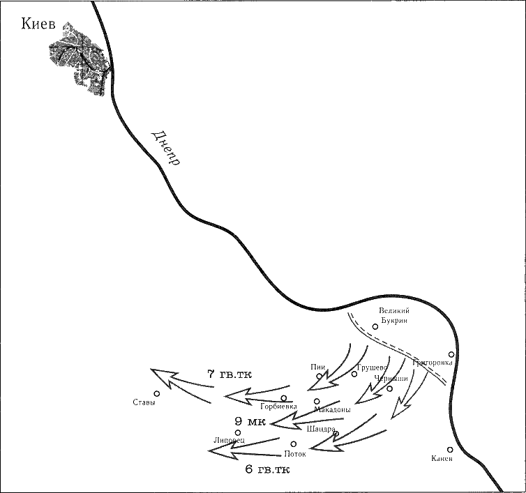 — 9-й мехкорпус наступает в направлении Малый Букрин, Дудари, Макадоны, имея ближайшей задачей выйти в район Дудари, к исходу второго дня наступления достичь Горбиевки, с выполнением ближайшей задачи выйти во второй эшелон армии и наступать за центром армии в общем направлении на Расавку.431