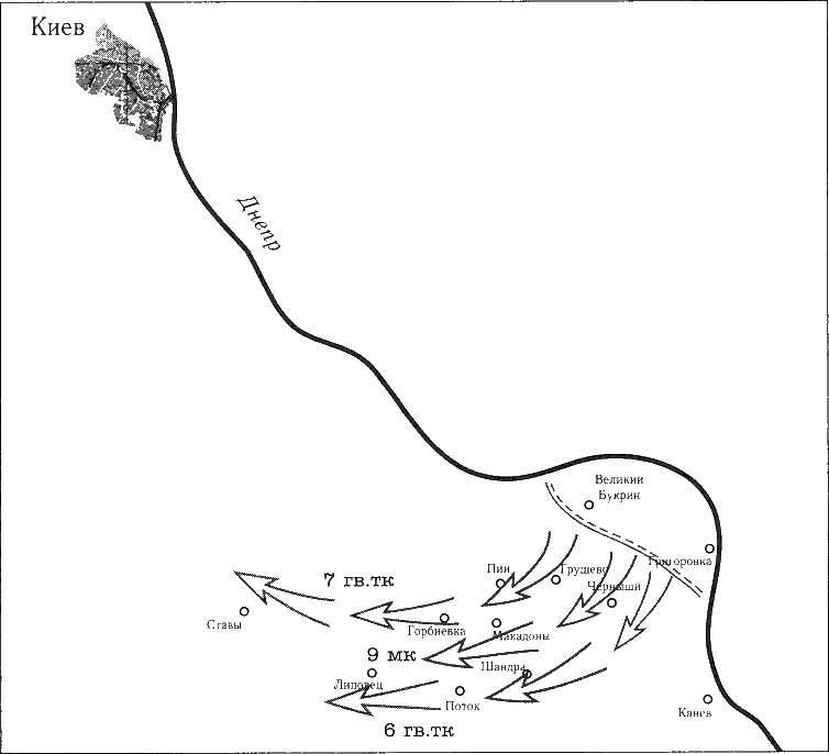 — 6-й гвардейский танковый корпус должен был пройти через боевые порядки 9-го мехкорпуса у Малого Букрина и занять исходное положение в районе Канада; двигаясь за 161-й и 42-й гвардейскими стрелковыми дивизиями, обогнать пехоту на рубеже Медведовка, Грушево и развить наступление в направлении Пии, имея задачей к исходу дня выйти в район Корытище;