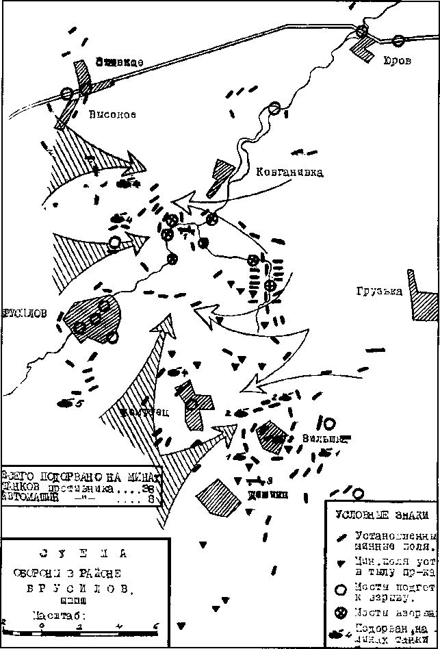 В ходе оборонительных боев под Брусиловом войска армии вновь применили хорошо зарекомендовавшие себя под Фастовом установку подвижными группами заграждения групп («очагов») на путях наиболее вероятного движения противника и уничтожение подрывом подбитых танков. За 12 дней оборонительных боев под Брусиловом саперы армии установили 198 минных «очагов» (5749 противотанковых мин), на которых подорвались 39 танков, в том числе 3 «Тигра», и 4 бронетранспортера, и подорвали 48 подбитых танков противника, в том числе 10 «Тигров».494