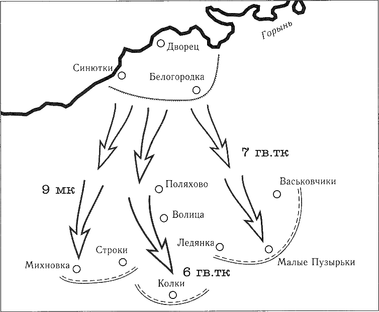 — 6-му гвардейскому танковому корпусу — наступая в общем направлении Михиринцы, Большие Жеребки, к исходу дня достичь рубежа Купель, Глядки, Копачевка;