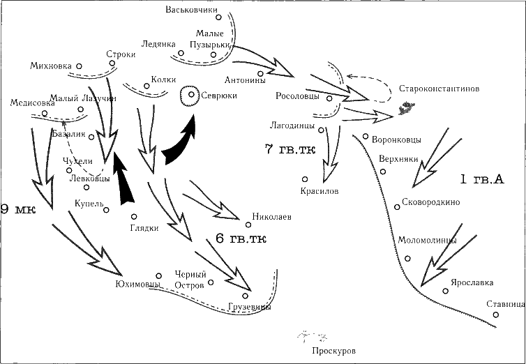 — 9-му мехкорпусу силами не менее одной мехбригады занять оборону на рубеже Большая Бубновка, Дзеленцы, Хоменцы фронтом на запад, прикрывая армию от контрударов противника, остальными силами в ночь с 11 на 12 марта атаковать Проскуров с северо-запада, по овладении городом занять оборону в районе Шаровечка фронтом на запад, не допуская прорыва противника с запада;