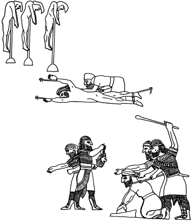 «Богатых и знатных, – повествует одна из царских наскальных надписей, – которые все были повинны в бунте, я освежевал; кожей их я обтянул пирамиду… три тысячи их приближенных я сжег на костре. Я не оставил ни одного человека из них как заложника… некоторым я отсек руки и ноги, другим я отрезал носы, уши и пальцы; некоторым из солдат я вырвал глаза… их юношей и дев я сжег на жертвенниках».