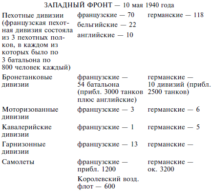 Союзники имели примерное равенство по истребителям, но уступали по пикирующим бомбардировщикам. Что же касается танков, то французские танки имели в целом более мощное вооружение и бронирование (танк «В» считался лучшим из существующих), но менее скоростными и с меньшим запасом хода. Британские бронетанковые силы были примерно на уровне немецких.