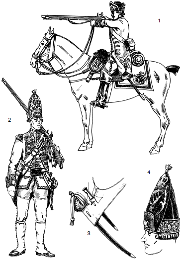 1 – офицер 11-го драгунского полка, около 1756 года; 2 – гренадер 17-го пехотного полка, около 1750 года; 3 – портупея гренадера и подвеска для сабли и штыка; 4 – гренадерский кивер 18-го Королевского ирландского полка