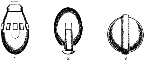 Неудачные новшества: 1 – удлиненная винтовочная пуля конструкции капитана Нортона, 1824 год; 2 – овальная пуля с экспансивным клином В. Гринера, 1835 год; 3 – круглая пуля с ободком к двухнарезной винтовке Брунсвика, 1836 год