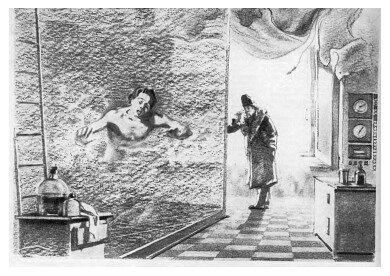Тотчас на поверхности пены остался круг, а в зеленоватой полумгле за стеклом было видно, как белое тело человека, медленно поводя руками, двигалось ко дну. Вот оно мягко осело в толстый слой тины, вытянулось и замерло. Профессор Рей вынул часы, отсчитал минуту-две… Марк все так же неподвижно лежал в тине. Тогда Рей стал одно за другим распахивать окна лаборатории. Вздулись шторы, клубами ввалился пар, морозный ветер пронесся по залу, взвивая снежную пыль. Тонко зазвенела посуда. Дуя на коченеющие пальцы, профессор Рей дергал задвижки…