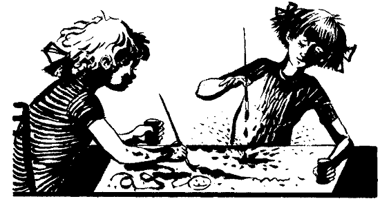 С этого вечера Валентин Борисович на целых два месяца увлёкся выпусканием "Яичницы". Он стал её главным редактором, а Катя и Манечка — главными сотрудниками. Папа рисовал карикатуры, Катя сочиняла стихи, а потом Катя с Манечкой кисточками старательно рисовали красивую зелёную рамку и всякие там звёздочки, бабочки и цветочки.