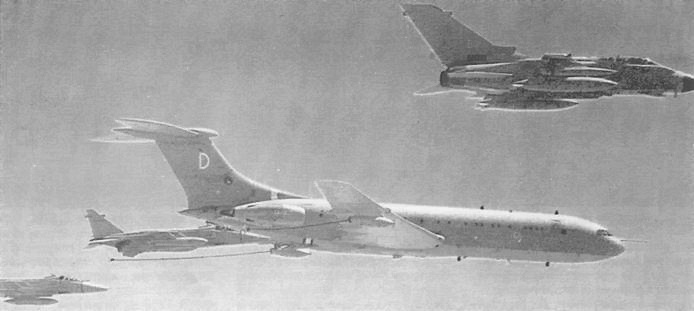 Одновременно с созданием бомбардировщика велось проектирование самолета-аналога, получившего обозначение «тип 707», который являлся уменьшенной в три раза копией «типа 698». Силовая установка аналога состояла из одного ТРД Роллс-Ройс «Дер- вент» (1 х 1630 кгс), установленного в хвостовой части фюзеляжа. Воздухозаборник располагался над фюзеляжем. Первый полет «707»-го состоялся 4 сентября 1949 г., однако после пятого полета в результате неполадок в электросистеме машина потерпела аварию и была полностью разрушена. 6 сентября 1950 г. в воздух поднялся опытный самолет «707В», имевший незначительные отличия от первого самолета. Одной из особенностей схемы с треугольным крылом, которая была выявлена при испытании этой машины, явился поздний отрыв носового колеса при разбеге, когда скорость приближалась к взлетной. Это приводило к резкому «взмыванию» машины. Проблема была устранена за счет удлинения носовой стойки, что привело к увеличению угла атаки при взлете (если бы не было самолета «707В», потребовалась бы дорогостоящая работа по переделке конструкции шасси бомбардировщика). «707В» в течение двух лет выполнил 380 полетов, налетав в общей сложности 130 ч.