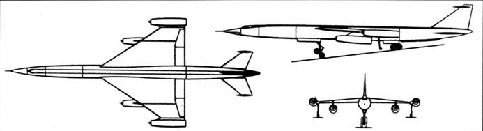 Еще один весьма экзотический проект разрабатывался с 1955 г. под руководством П.В. Цыбина, возглавлявшего ОКБ-256 Государственного комитета авиационной техники (ГКАТ) при Совете Министров СССР. Предполагалось создать своеобразную двухступенчатую систему, состоявшую из самолета-носителя (на первом этапе предполагалось использовать специально модернизированный самолет Ту-95Н, а с 1956 г. в ОКБ А.Н. Туполева начал прорабатываться специальный носитель – самолет «108», имеющий треугольное крыло и способный развивать скорость до 1500 км/ч). Второй ступенью должен был являться одноместный реактивный самолет- бомбардировщик PC, способный развивать скорость до 3000 км/ч. Его предполагалось оснастить двумя спаренными ЖРД- ускорителями и двумя крейсерскими прямоточными воздушно- реактивными двигателями (ПВРД) конструкции Бондаренко (одновременно в ОКБ С.М. Лавочкина и В.Н.Челомея разрабатывались беспилотные крылатые летательные аппараты «Буря» и «Буран», оснащенные такими же двигателями и имеющие межконтинентальную дальность полета при Мкр.=3). Расчетная суммарная дальность полета самолета PC составляла 12 500-13 500 км.