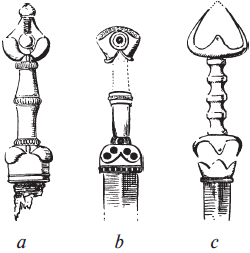Возможно, что самые поздние из них представляют наибольший интерес, хотя качество украшений на них сильно снижается, а на целиком сохранившемся экземпляре из Дурхема (рис. 28, b) оно настолько плохо, что их можно без преувеличения назвать дешевыми и вульгарными. Тем не менее у этих мечей хороший клинок, явно римского производства. Сохранилось несколько экземпляров с целыми или практически целыми рукоятями; по всему видно, что это римско-британский, а не чисто кельтский тип (на рис. 28, а и 28, с изображены два меча, датируемые I в. н. э.).