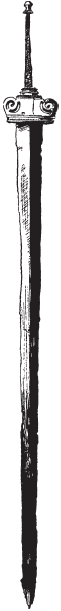 Именно мечам, найденным в болоте Нидам, археологи обязаны подробными сведениям о мечах «узорной сварки». Были откопаны образцы 98 нидамских клинков, но только много позже был определен характер такого способа изготовления лезвий и дана оценка соответствующей технике. Изначально эти клинки считали вариантом дамасских (само по себе это слово употребляется неверно), а технику в основном называли «ложнодамасской», хотя многие немецкие ученые графически описывали ее как Wurmbunt. Большая часть мечей этого периода (первые четыре столетия нашей эры) были двухлезвийными, в среднем приблизительно 30 дюймов в длину и шириной около 1,5 дюйма у рукояти. Они очень слабо сужались к более или менее лопатообразному кончику и в большинстве случаев (хотя ни в коем случае не всегда) были снабжены широкой и мелкой вогнутостью, слишком мелкой, чтобы ее можно было назвать желобком, которая шла по всей длине клинка. У многих мечей бывало две, три, а в отдельных случаях и четыре мелких желобка вместо этого широкого «дола» [10] . По большей части эти мечи были меньше и легче, чем в последующие эпохи викингов и Средневековья, хотя и имели ту же форму. Однако в этих болотах найдено несколько мечей совершенно другого типа, с такими очертаниями лезвий, которых мы больше не встретим до 1350 г. Это оружие, длинное, тонкое, остроконечное, в сечении имеющее форму срезанного ромба, использовала римская вспомогательная кавалерия. Два или три экземпляра этого редкого типа были найдены в хорошем состоянии, лучшие из них, возможно, происходят из болота Вимоза. Это ложнодамасские клинки общей длиной приблизительно 40 дюймов, с рукоятью длиной 7,5 дюйма. Ширина у рукояти немного больше 1,5 дюйма (рис. 38). Выглядящая очень массивной гарда сделана из полой бронзы, на ней в качестве украшения вылиты две спирали, напоминающие латенский декоративный стиль. Оставшаяся часть рукояти, первоначально сделанная из дерева или кости, утрачена, но возможно, что она была такой же, как и рукояти коротких римских мечей – с большим сферическим навершием. В этом случае его венчала элегантная бронзовая шишечка. В болоте Нидам нашли еще два таких же клинка. Обычный легионерский меч в Дании нашли только один.