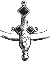В данном случае способ крепления ножен к перевязи принципиально отличается от того, который использовали для мечей типа II. Это делалось либо с помощью двойных крючков (похожих на маленькие якоря), прикрепленных к кольцам с каждой стороны от «медальона», или с помощью так же расположенных незамкнутых колец. По-видимому, их цепляли к кольцам, закрепленным на конце ремней способом, который приобрел большую популярность в XV в.; но тонкие полоски, вверх и вниз тянущиеся от медальона, по-прежнему напоминают кельтские петли. На лентах возле устья ножен мы видим такие же головки хищных птиц, которые украшали готский меч из Тамани.