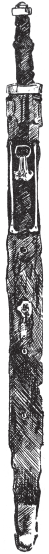 Судя по району распространения мечей другой типа (II), можно предположить, что их по большей части использовали германские народы, жившие в Центральной и Восточной Европе. Напротив, тип 3, по-видимому, встречается исключительно на севере, причем большую часть экземпляров нашли в Дании. Те два, которые я выбрал в качестве примера мечей такого типа, обнаружены в Крагехуле; они настолько хорошо сохранились, что не нужно сильно напрягать воображение для того, чтобы представить себе их вид до того, как эти мечи «принесли в жертву» в 450 г. Они очень похожи, за исключением одной вещи: у одного широкий клинок с тупым концом, а другой тонкий, остроконечный. Узость оковки ножен, которая вполне сохранилась, доказывает, что клинок второго и был таким, а не приобрел свою форму благодаря тому, что края подверглись коррозии от времени. Случается, что из-за воздействия ржавчины или слишком частой заточки во времена использования клинок становится намного уже и его очень трудно классифицировать, но здесь у нас есть на что опереться. Судя по всему, форма рукояти является модификацией типа I, в ходе которой концы рукояти были растянуты по поверхности нижней и верхней гарды и приобрели форму конуса, а бороздки со всей поверхности переместились в центральную ее часть. Эти рукояти выглядят неуклюжими, но в действительности они очень широкие и хорошо ложатся в руку. Многие из них делали из дерева, покрытого бронзой, серебром или золотом, но встречаются экземпляры, целиком отлитые из бронзы. В целом меч выглядит тяжеловатым, поскольку у него не только массивная рукоять, но и совершенно особенная оковка, большая и серьезная. Совсем недавно в Судане существовали мечи с рукоятями совершенно такого же вида; все знают, какое оружие использовали в 1880 г. так называемые «фуззи-вуззи»; реже можно встретить нечто похожее на рукоять скандинавских мечей IV в. На рис. 46 я набросал оружие, которое увидел, когда отдыхал в отеле в Северном Девоне.