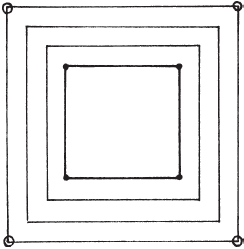Правила хольмганга были таковы: плащ под ногами сражающихся должен быть десяти футов из конца в конец и с петлями в каждом углу, сквозь которые продевали колышки с головкой вверху. Все это называлось тьеснур. Затем вокруг плаща нужно было нарисовать три квадрата на расстоянии одного фута друг от друга. За ними нужно было поместить четыре столба под названием хослур (ореховые колья). Все вместе называлось Ореховым полем (рис. 73). У каждого из сражающихся должно было быть по три щита, и когда они приходили в негодность, то владельцы обязаны были вернуться на плащ, даже если до того сошли с него, и защищаться оставшимся оружием. Тому, кто получил вызов, принадлежит право ударить первым. Если кого-либо ранили так, что кровь попадала на плащ, он мог прекратить сражение. Если один из противников выходил за колья одной ногой, считалось, что он отступает; если двумя – что он бежал с поля боя. Перед каждым бойцом кто-то должен был держать щит. Тот, кто получит больше ран, обязан был заплатить хольмслаусн (выкуп за то, чтобы освободиться от боя) в три марки серебром.