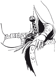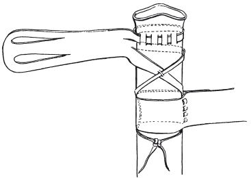 Как мы видим, в течение последних двух веков форма меча очень мало менялась; то же самое можно сказать о ножнах и предметах, посредством которых владелец носил свое оружие. Один из лучших показателей, дающих представление о том, как это делалось, – скульптурное изображение Дитриха фон Брена в Нюмбургском соборе, созданное приблизительно в 1265 г. (см. рис. 88). Здесь мы видим широкий пояс из кожи или оленьей шкуры (скорее последнее, поскольку она имела свойство сохранять форму и мягкость после намокания), закрепленный вокруг ножен в 5–6 дюймах от устья; владелец перекидывал его справа налево. Второй короткий, но широкий кусок кожи крепился непосредственно под устьем и шел в обратном направлении – слева направо. Свободный конец пояса разделялся надвое, а ремешок снабжался двумя разрезами. В то время как пояс обвивался вокруг бедер, два хвоста протягивались в щели в ремешке спереди и завязывались узлом. Существует множество изображений, воспроизводящих этот простой и эффективный метод крепления меча, некоторые из них относятся еще к X в. (их можно найти в Евангелии Оттона III, датирующемся 983–991 гг.). Нужно отметить, что в то время, как практически все скандинавы и германцы использовали такой стянутый пояс, по-видимому, он никогда не был популярен в Англии, Франции и на юге Европы. В этих странах ремешок с разрезами заменяла простая пряжка, а свободный конец пояса ниспадал с левой стороны рукояти (см. рис. 92 и 94). Существовало множество способов крепления ремня к ножнам, но все они были вариациями все того же принципа, который показан на рис. 119. На английских иллюстрациях и скульптурах видно, что вместо разделенных концов ремня или пряжки, благодаря которым кожаные полоски образовывали в передней части ножен диагональный крест, здесь через переднюю часть всегда шел только один кусок кожи (вниз, справа налево); другой проходил сзади. Если посмотреть на мемориальную доску сэра Роберта де Бюра из Эктона, графство Суффолк (1302 г., рис. 94), то там это очень ясно изображено. Такой метод соединения пояса и ножен обеспечивал надежное крепление, при котором меч оказывался под углом к бедру, и в то же время, если какая-либо часть пояса оказывалась не в порядке (что вполне могло случиться), ее легко можно было заменить. Диагональные ремешки между основными кожаными лентами, которые крепили концы пояса к ножнам, служили для того, чтобы он не мог соскользнуть.