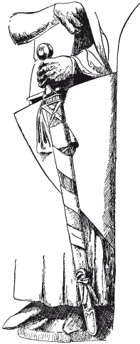 По моему мнению, это окончательно доказывает, что пояс из гроба Фернандо никогда не предназначался для ношения оружия, но оказался единственным сохранившимся экземпляром предмета, таким замечательным образом подчеркивающего ранг владельца, который носили знатные люди обоего пола. Тем не менее общее мнение относительно предназначения этого пояса принимается как должное; величественность и притягательность геральдики затенила его действительный смысл. В течение XIII столетия много фигур рыцарей, будь то рисунки на гробнице короля Джона или Вильгельма фон Гройтша или статуи наподобие гамбургских, изображали воинов в обычной одежде, и мечи они держат в руке так же естественно, как мы с вами держали бы свернутый зонт. В особенности сильно это проявляется в Германии, где после 1300 г. лишь на одном из десяти изображений с гробниц можно увидеть доспехи, хотя в других местах дело обстоит совсем иначе. В Средние века у знатных людей не было в обычае расхаживать в повседневном платье с мечом в руке, как это делалось с XVII в. до конца XVIII в. Бывало, что в таких случаях прикрепляли к поясу кинжал, но меч пристегивали к поясу очень редко. Если его и брали с собой по какой-либо особой причине, то либо несли в руке, обернув пояс вокруг ножен (рис. 121), либо (и это наиболее возможный вариант) поручали это дело пажу или оруженосцу.